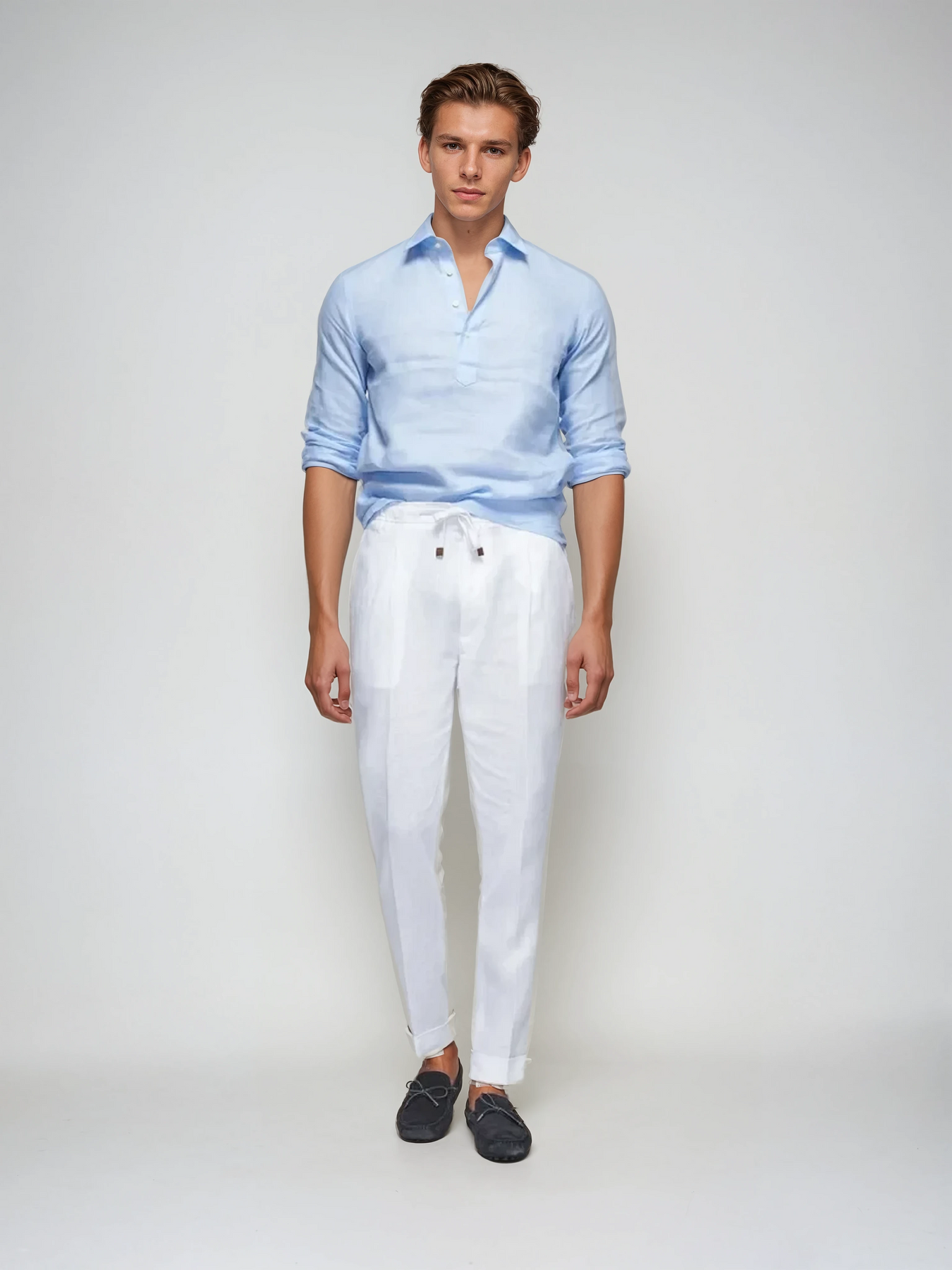 Lněná Pop-over Košile – Světle Modrá je ideální pro formální i neformální příležitosti. Noste ji s lněnými kalhotami pro letní vzhled nebo ji kombinujte s chinos pro elegantní smart-casual vzhled.