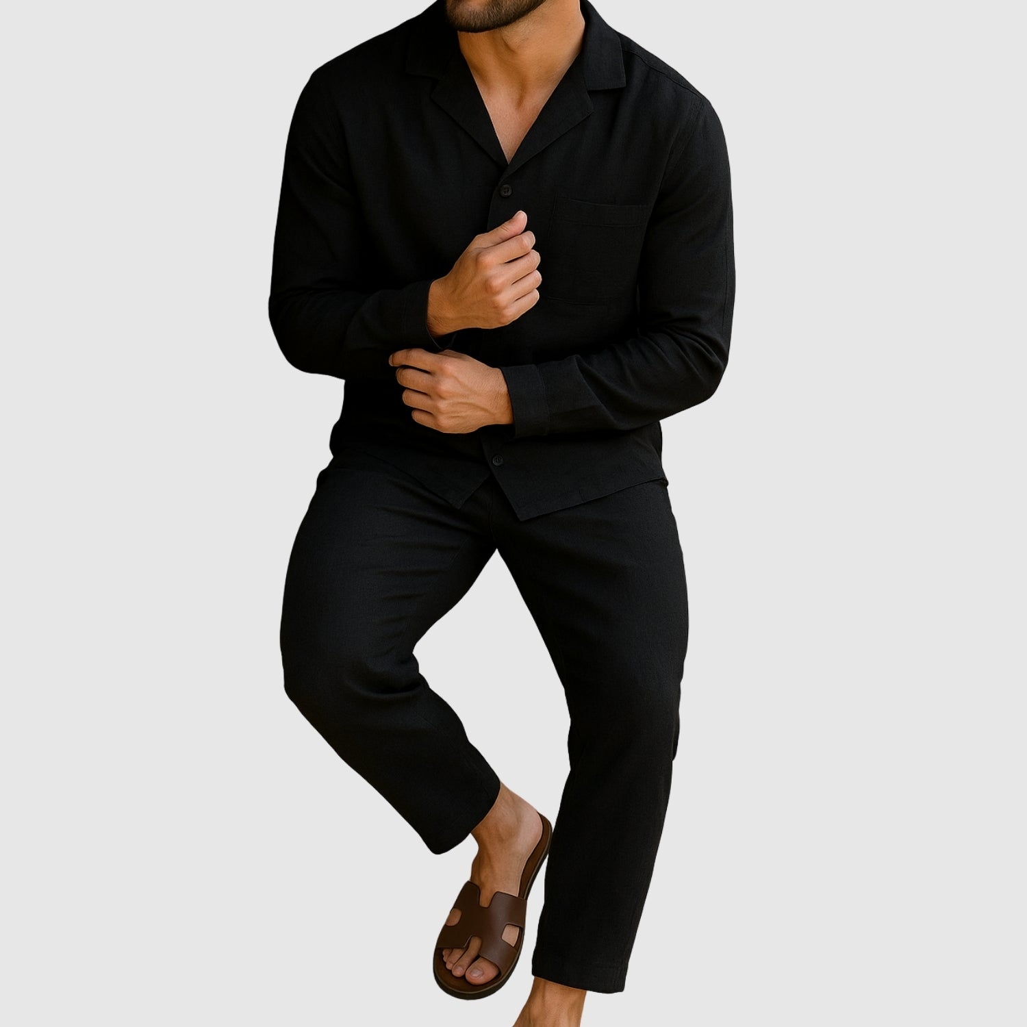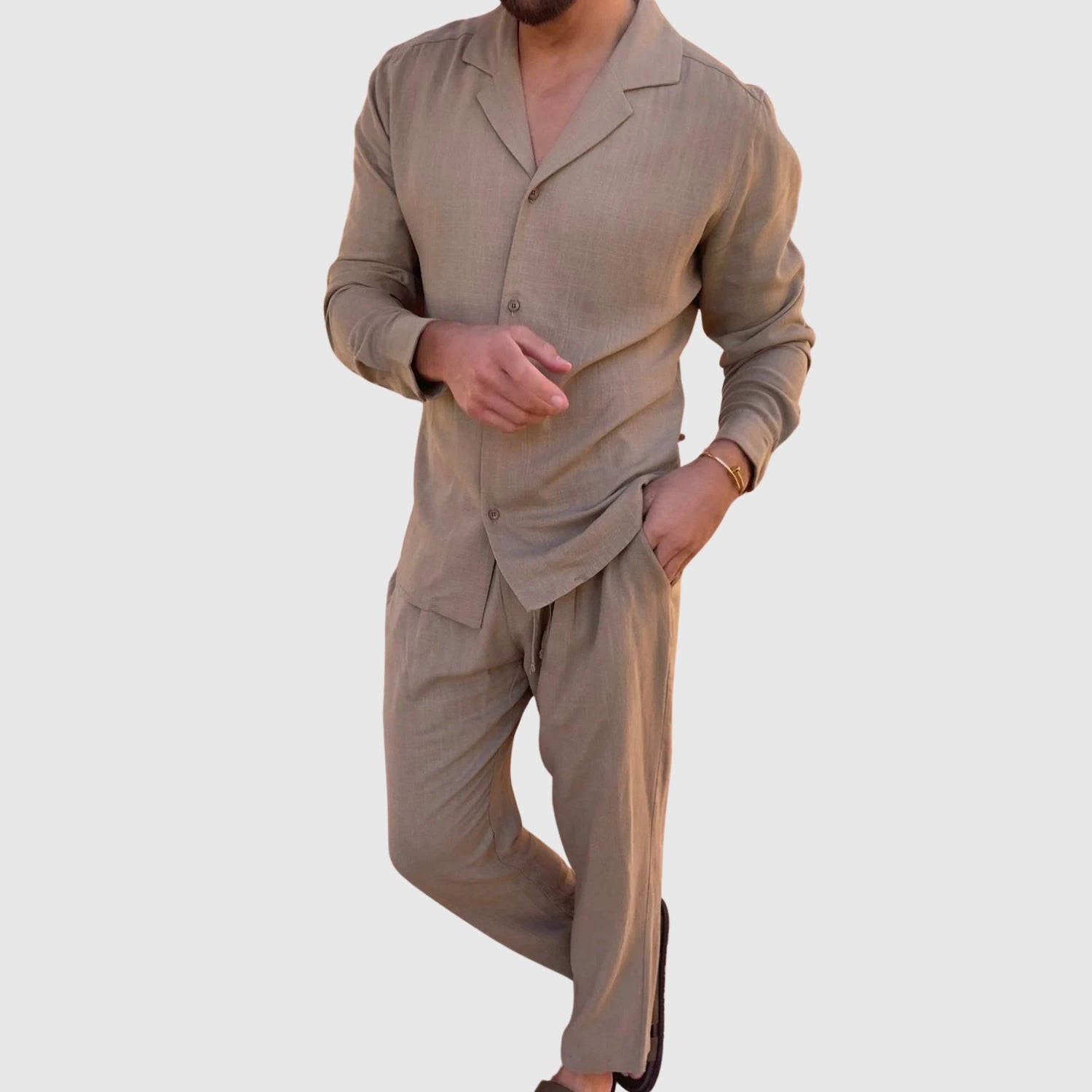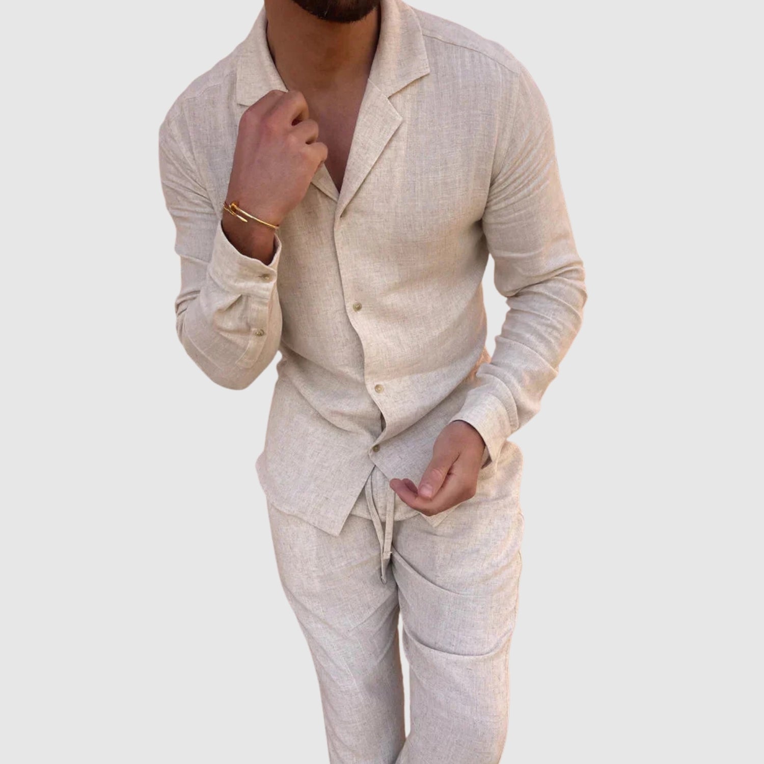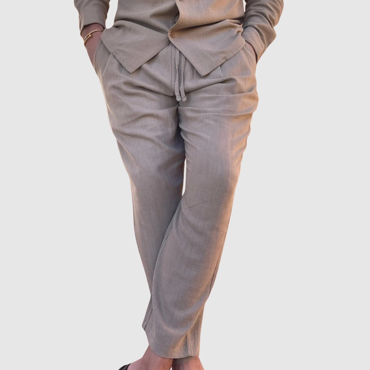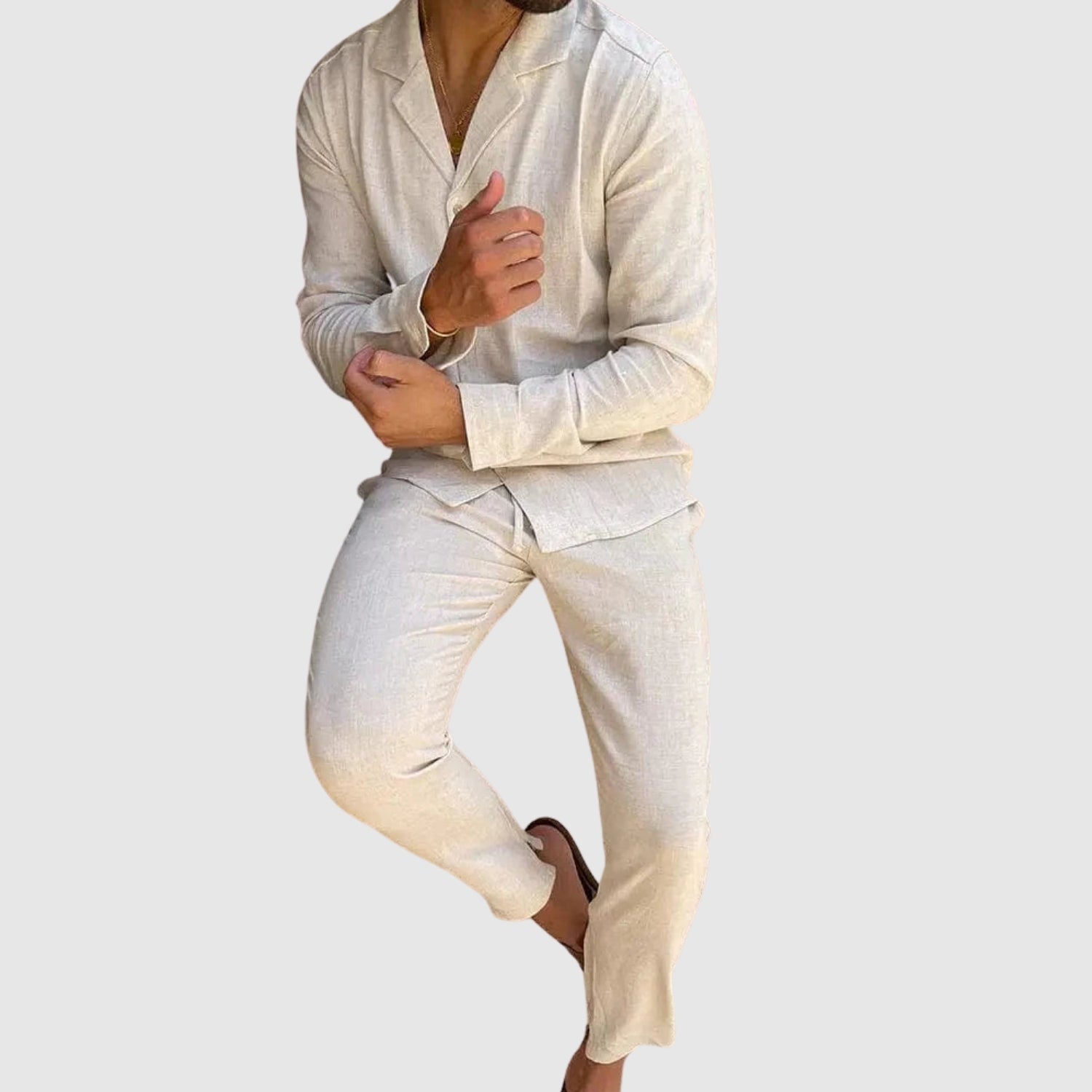 Tento lněný komplet nabízí dokonalou kombinaci pohodlí a stylu. Jeho lehká a prodyšná tkanina vás udrží v pohodlí po celý den, zatímco jeho sofistikovaný design vám umožní vypadat bezchybně při každé příležitosti, od neformálních setkání až po speciální události.